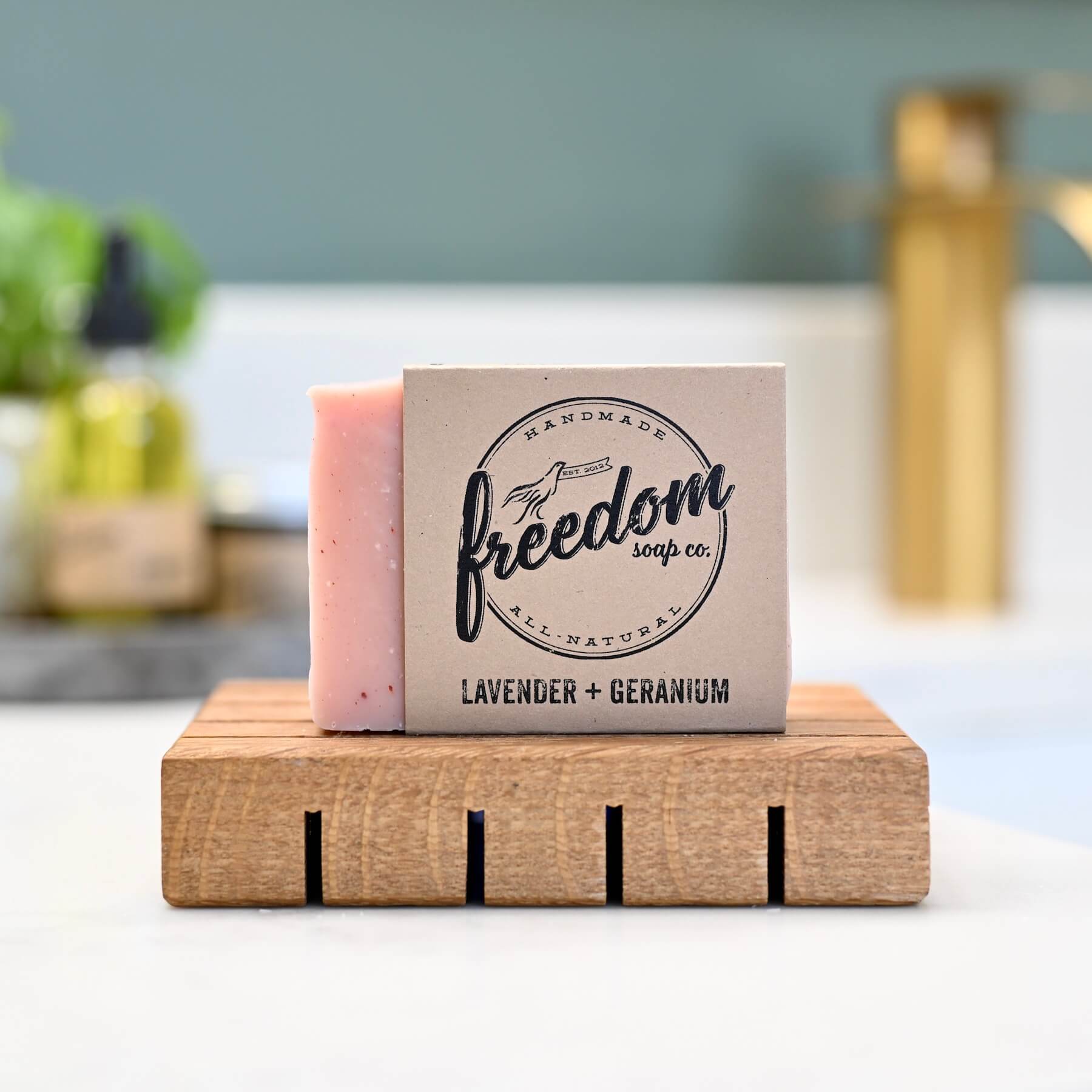 Our Lavender + Geranium Bar brings together two soothing botanicals known for their ability to relax the mind, nourish the skin, and lift the spirit.