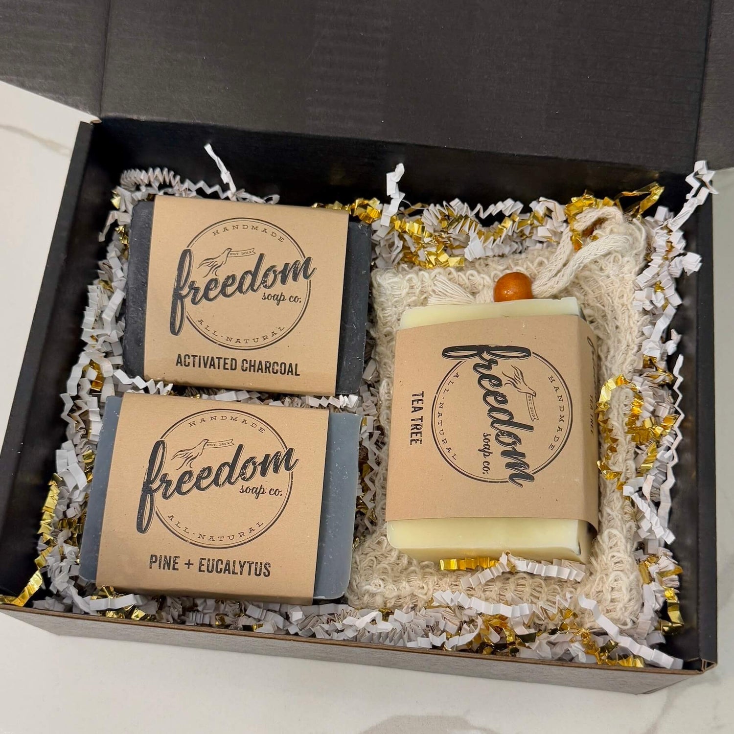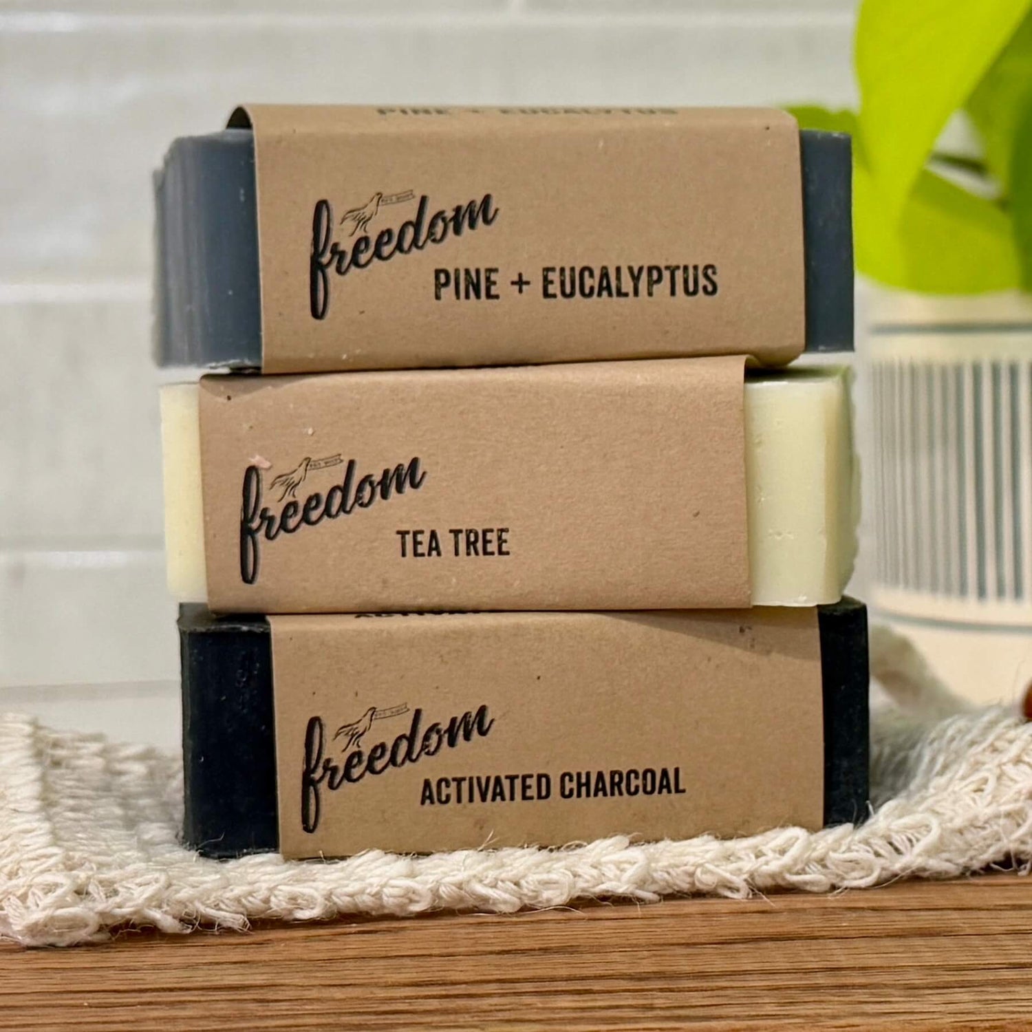 The Men’s Soap Bundle brings together Pine + Eucalyptus, Activated Charcoal, and Tea Tree, handmade in small batches with all-natural oils and essential oils to balance, protect, and invigorate your skin.