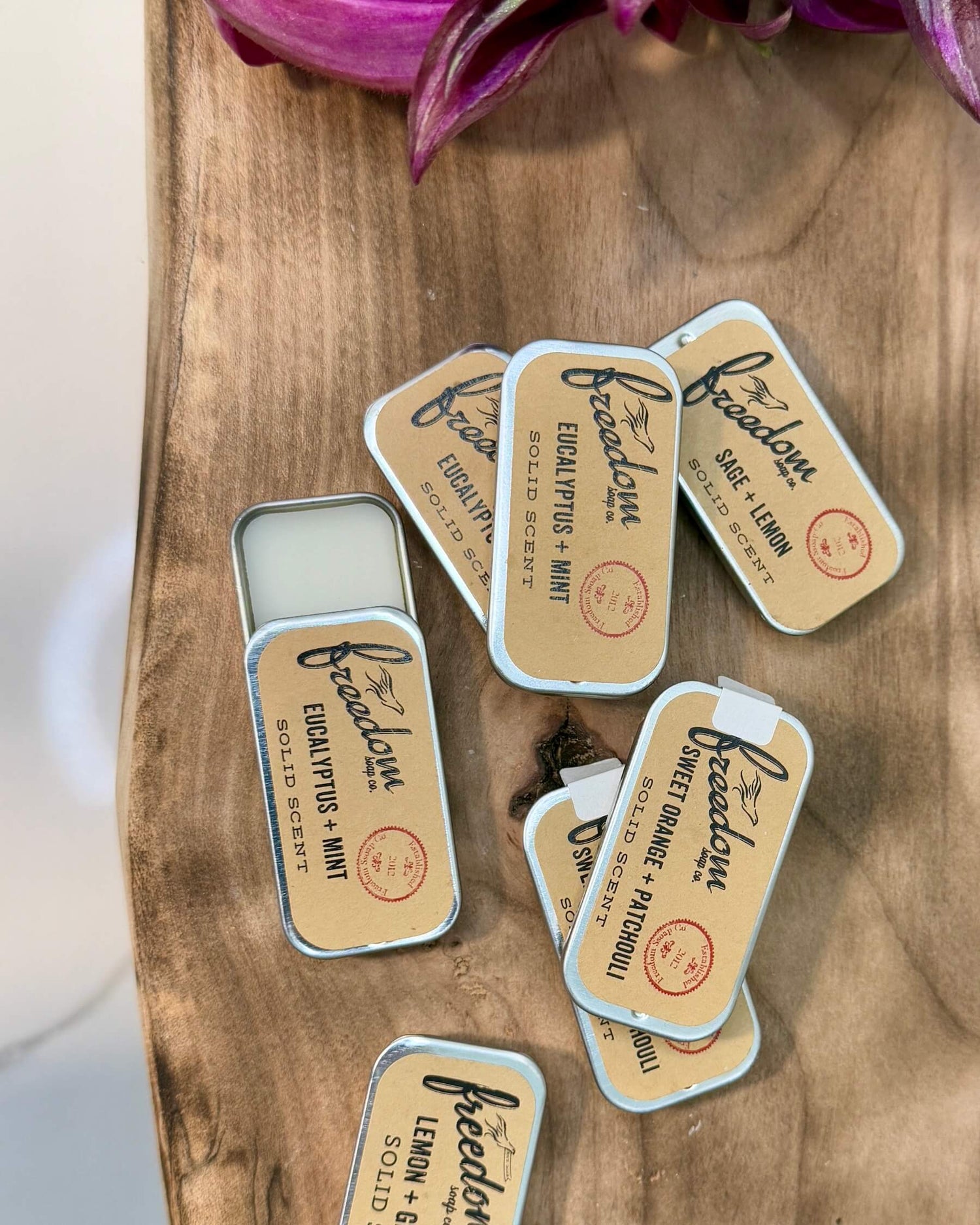Handcrafted Solid Scents made with real essential oils and skin-loving ingredients, no sprays, synthetics, or overpowering clouds. Just a subtle, natural scent that feels good to wear.