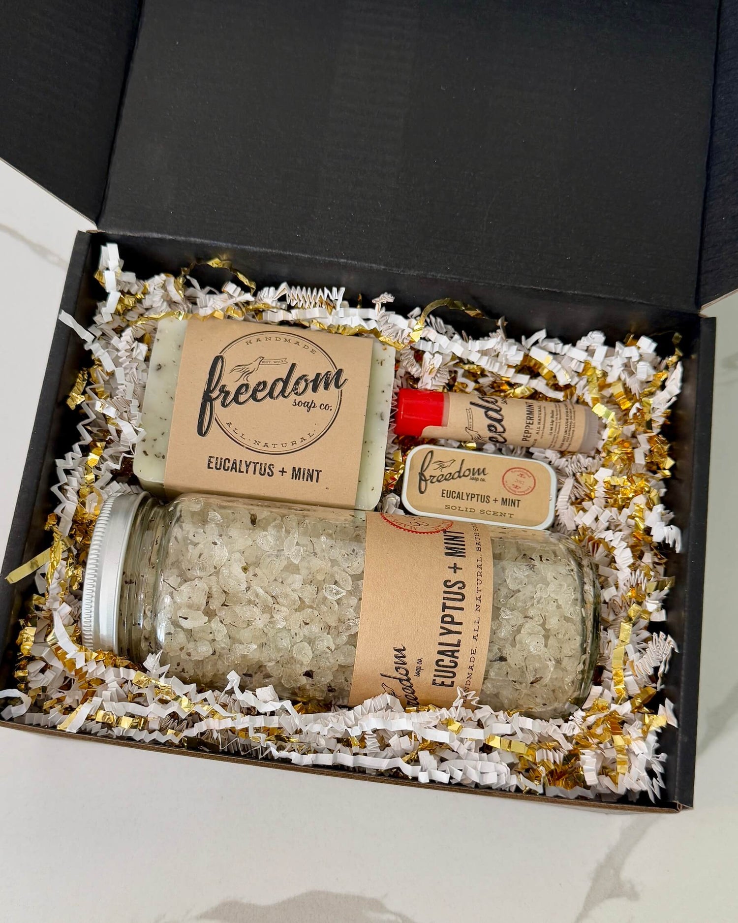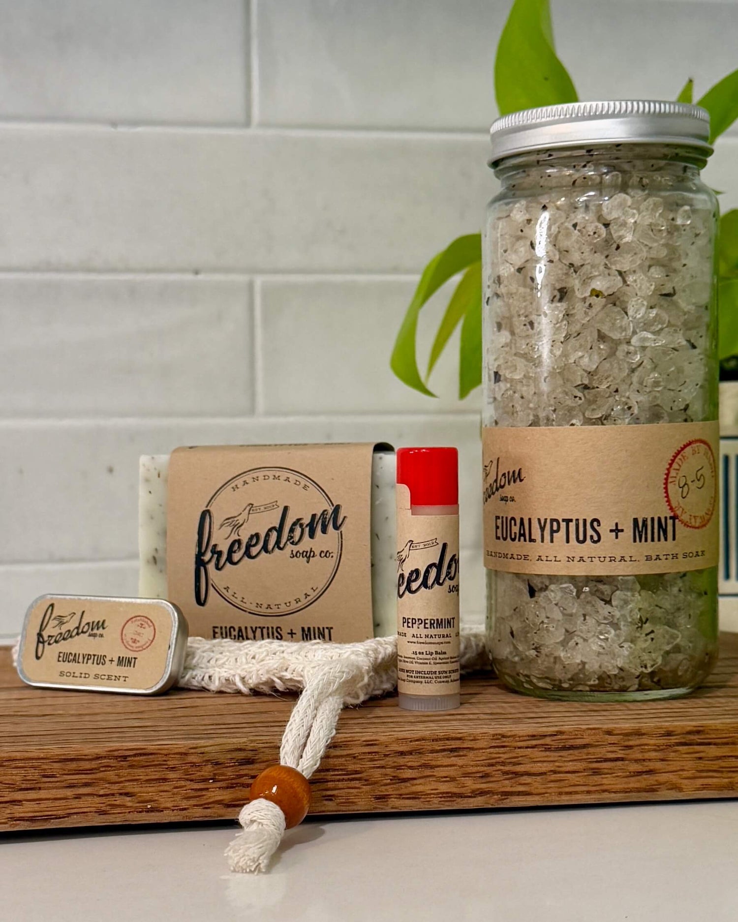 - Eucalyptus + Mint Bath Salts - Mineral-rich salts draw out impurities and ease muscles while eucalyptus and mint open your senses.