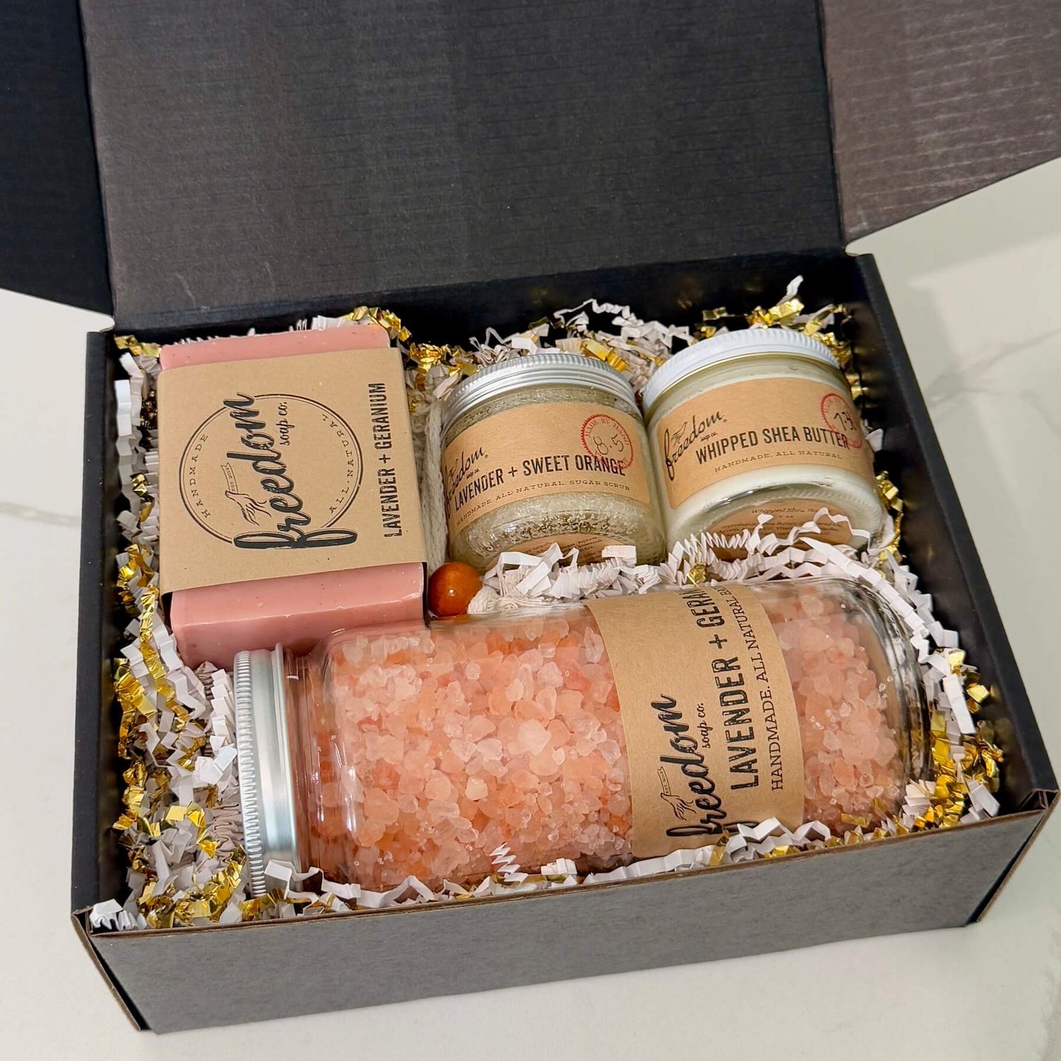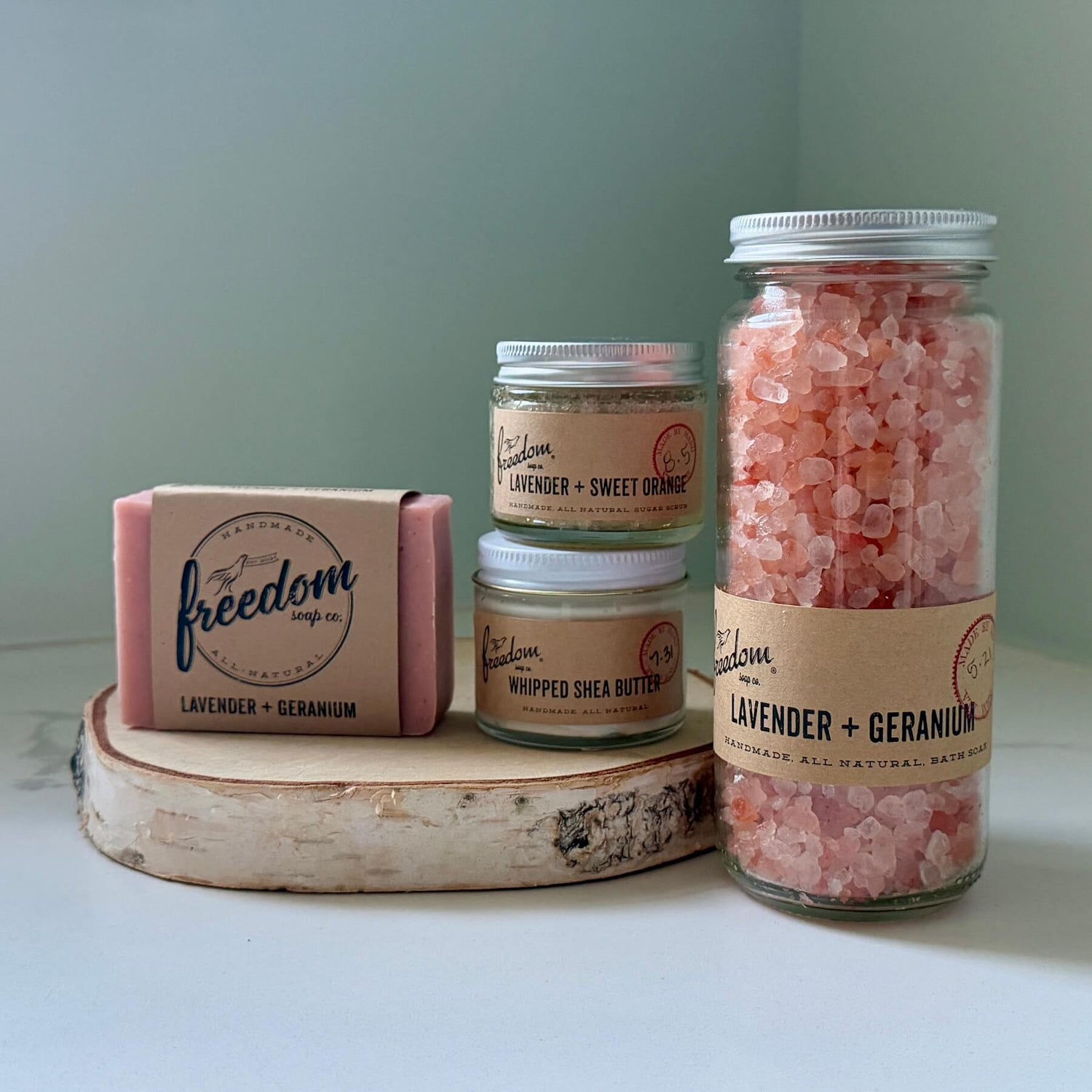 - Lavender + Geranium Salt Soak (8 oz.) relaxes the body and calms the mind